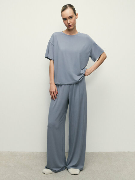 Составь комплект: Домашняя футболка 51003499164 Домашние брюки создают атмосферу комфорта и уюта. Они выполнены в прямом крое, что подчеркивает женственность и обеспечивает свободу движений. Ткань мягкая и тактильно бархатистая, с добавлением эластана. Такой материал идеально подходит для одежды, в которой хочется отдыхать, не думая о дискомфорте. Легкие брюки нежного оттенка подходят для теплых вечеров или спокойных дней. Их средняя посадка и пояс на кулиске позволяют легко регулировать степень прилегания к телу, чтобы добиться желаемого уровня комфорта. Брюки без лишних излишеств: модель выполнена без карманов, поэтому не отвлекает от основного назначения — быть максимально комфортной. Это идеальная пижама для тех, кто ценит комфорт во время сна и отдыха. Брюки пижамные гармонично дополнят рубашкой, футболкой или майкой в зависимости от настроения и времени суток. Они станут отличной основой для создания образа для дома и сна. Сделайте выбор в пользу данной пижамы, которая обязательно станет вашим любимым элементом домашнего гардероба. Приобретя к брюкам комплектную футболку от Zarina, вы сможете полноценно наслаждаться качеством и сделать акцент на домашнем стиле. Такой вариант станет прекрасным подарком для близких людей — сочетание стиля и комфорта никого не оставит равнодушным.