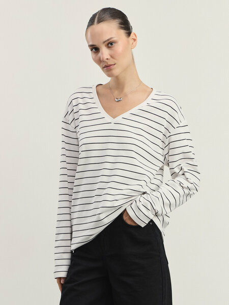 Базовый женский лонгслив станет отличным дополнением повседневного гардероба. Особенностью модели является свободный крой, который обеспечивает комфорт на весь день. Плотная ткань приятна к телу и позволяет сохранить тепло в прохладную погоду. Этот элемент одежды создан для тех, кто ценит стиль и удобство. Принт в виде полосок добавляет интересный акцент и привносит свежесть в образ. Такой дизайн является универсальным и подходящим для различных ситуаций. Комбинируйте его с разными вещами вашего гардероба – от джинсов до юбок, что позволяет легко создавать стильные образы каждый день. Треугольный вырез выгодно подчеркивает линию шеи, акцентируя внимание на декольте. Это придает женственности даже самому простому наряду. Подходит как для будничных прогулок, так и для досуга с друзьями или семьей. Свободная посадка гарантирует легкость движений, не стесняя их ни при ходьбе, ни при активных действиях. Благодаря этому лонгслив подходит для любой фигуры и скрывает мелкие несовершенства. Проработанные швы повышают долговечность изделия и обеспечивают аккуратный внешний вид.