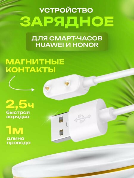 Зарядка для часов, кабель USB для фитнес браслета - смарт часы honor Huawei Watch Fit, Fit mini, Watch Fit 2, Huawei Band 6, Huawei Band 7, Huawei Band 6 Pro, Honor Watch ES, Huawei 4 Pro, 4x предназначен для зарядки smart watch от портативного зарядного блока, автомобильного адаптера, power bank или компьютера. Honor band 6 часы; huawei band 7; huawei watch fit; honor watch es; honor watch 4x можно заряжать, не снимая ремешок и не вынимая капсулу. Зарядное устройство на смарт часы huawei watch выполнено из высококачественных материалов и оснащено двумя магнитами (расстояние между магнитами – 11 мм). Длина кабеля для зарядки часов – 1 метр. Зарядное устройство на умные часы smart watch, очень компактное и его удобно брать с собой. Вы сможете заряжать фитнес браслет дома, в машине, в офисе или в общественном транспорте. Благодаря оплётке термопластичного каучука, кабель на смарт часы хонор Бенд 6 / Бенд 7 / watch es / watch fit устойчив к внешней среде и к температурным воздействиям.