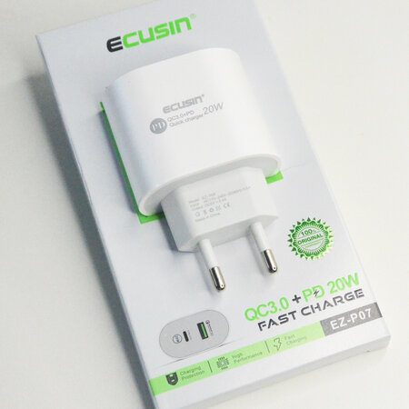 Сетевое зарядное устройство ECUSIN PD+QC3.0 20W White USB+TYPE-C является отличным устройством для зарядки вашего гаджета через USB и Type-C порт. Поддерживает технологию быстрой зарядки Quick Charge 3.0. Стильный дизайн и превосходное качество.