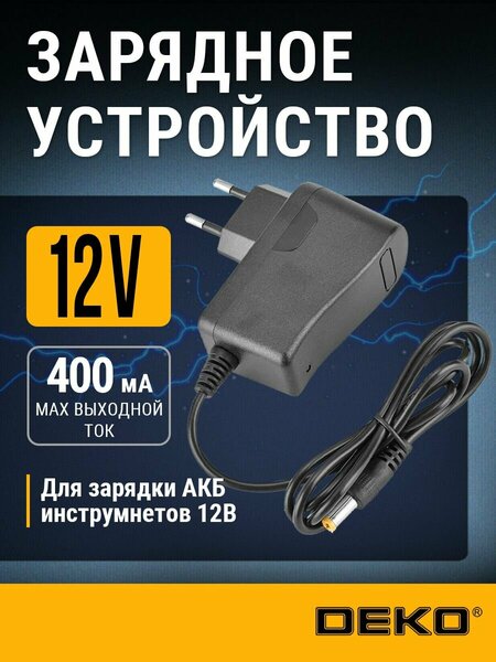 Сетевой зарядный блок (зарядка) DEKO DC12V предназначен для восстановления емкости аккумуляторного инструмента DEKO (серии DKCD, Banger, GCD) напряжением 12В (12 вольт). Устройство обеспечивает зарядку литиевых (Li-ion) аккумуляторов напряжением 12V со стабильными параметрами питания и защитой от перегрузок. Этот адаптер является универсальным решением для заряда шуруповерта с Li-Ion аккумулятором, триммера и другого инструмента бренда DEKO (ДЕКО). Компактный зарядник с выходным напряжением 12в подключается к сети 220В через кабель питания со стандартным штекером 5мм. Комплект включает само зарядное устройство и упаковку. Мини-формат и надежность делают его практичным дополнением к профессиональному и бытовому инструмента. Технические характеристики: Тип: Сетевой адаптер питания для Li-ion АКБ 12V Вход: 110-240В Выход: 13.5В, 0.4А Разъем: 5мм