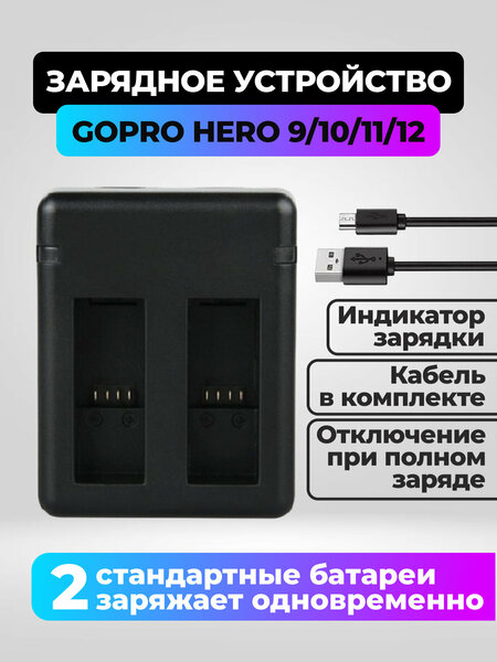 Зарядное устройство на две батареи для GoPro HERO 9/10/11/12 Зарядное устройство выполнено из качественного пластика и оснащено двумя слотами для одновременной зарядки двух аккумуляторов. Зарядное устройство использует безопасную плату постоянного тока, которая не приведет к перезарядке аккумулятора и его повреждению. Устройство автоматически отключится при полной мощности для защиты аккумулятора. В комплекте идет провод micro USB - USB 2.0 (Type A) который позволит зарядить Ваши аккумуляторы от стандартных вилок зарядки телефона. И также на корпусе есть разъем USB Type C. Устройство снащено светодиодными индикаторами, которые демонстрируют процесс зарядки и его окончание. Комплектация * Док-станция зарядное устройство для аккумуляторов - 1шт * USB кабель - 1шт