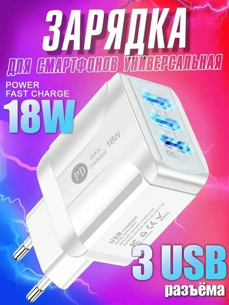 Зарядное устройство для телефона на 3 USB samsung, honor, xiaomi, realme, зарядка для iphone, блок питания универсальный для смартфона, белый