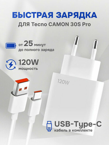 Зарядное устройство для телефона Tecno CAMON 30S Pro (Техно Камон 30S Про) / Быстрая зарядка 120W / кабель type c в комплекте