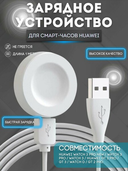 Зарядное устройство для smart watch имеет съемный кабель Type-C длиной 75 см (общая в сборе - 1 метр) и магнитную зарядку со входом тайп си. Провод зарядки Type C можно использовать отдельно для смартфона, планшета, наушников или Power bank. Корпус ЗУ выполнен из ABS материала, провод из ПВХ, что делает его гибче и удобнее в хранении. Зарядное на умные часы smart watch, очень компактное и его удобно брать с собой, хранить в машине, сумке или носить в кармане. Достаточно подсоединить кабель к адаптеру и приложить умные часы. Магнит надежно зафиксируется на смарт часах на задней части устройства и через несколько секунд начнется зарядка. Сетевое зарядное устройство можно использовать с адаптером или заряжать от компьютера или ноутбука через USB порт. Совместно с USB проводом для часов Huawei желательно использовать адаптер 1 – 2 Ампера, но не больше 2.5А. USB кабель для зарядки обеспечивает стабильную проводимость и надежный заряд аккумулятора девайса. Оберегайте сетевой шнур от животных, чтобы они не могли грызть его. Беспроводная зарядка подходит для следующих моделей умных смарт часов: ⌚ Huawei Watch 3 PRO New ⌚ Huawei Watch 3 PRO ⌚ Huawei Watch 3 ⌚ Huawei GT3 PRO ⌚ Huawei GT3 ⌚ Huawei Watch D ⌚ Huawei GT Runner ⌚ Huawei GT2 PRO ⌚ Huawei GT Cyber ⌚ Huawei GT 2 Pro Classic ⌚ Huawei GT 2 Pro Sport. Если сомневаетесь в выборе зарядного устройства, то задайте нам вопрос, указав вашу модель часов и мы с радостью поможем подобрать для вас подходящее устройство)