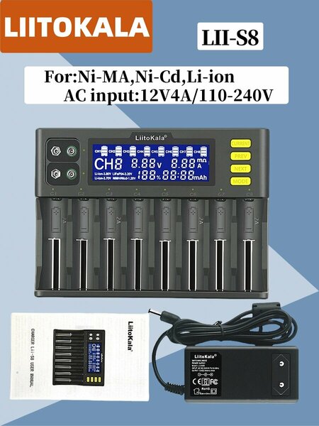 Особенности: Зарядное устройство с автоматическим определением полярности на 8 слотов Автоматическое определение полярности. Вход 12 В/4 А с общей мощностью 48 Вт. 8 слотов работают независимо. Его можно заряжать вместе с различными смесями аккумуляторов. Может вместить 32700, 26650, 21700, 20700, Ni-MH SC и другие большие батареи Разнообразная защита, безопасная зарядка. Технические характеристики: Фирменное Наименование: LiitoKala Номер модели: Lii-S8 Входное напряжение: 12 В постоянного тока/4,0 А Выходное напряжение: постоянный ток 4,2 В/1,48 В постоянного тока/3,65 В постоянного тока/4,35 В постоянного тока/9 В постоянного тока Выходной ток Ток зарядки литиевой батареи: 2000 мА * 4 / (300 мА/500 мА/700 мА/1000 мА) * 8 Ток зарядки NiMH аккумулятора: 500 мА * 8 Ток зарядки аккумулятора 9 В: 85 мА * 2 Совместимость со всеми аккумуляторными батареями; Ni-MH/Cd: AA, AAA, A, SC, C,9 В и т. Д. Размер Литий-ионный/IMR/LiFePO4:26650,20700,18650,18490, 17700 17500,16340(RCR123),14500 10440 Цвет: черный Размер основного элемента: прибл. 29,3*14,5*5,7 см Размер упаковки: прибл. 29,0*15,0*6,0 см Вес упаковки: Прибл. 830 г