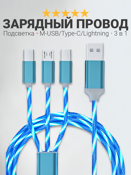 Зарядный кабель для iPhone, Android, iPad, Xiaomi, Meizu, 3 в 1, Type-C, Micro-USB, Lightning, светящийся. Зарядный кабель предназначен для зарядки и синхронизации различных устройств, включая iPhone, Android, iPad, Xiaomi, Meizu, Oppo и других. Кабель оснащен подсветкой, которая обеспечивает удобство использования в темное время суток или в условиях низкой освещенности. Цвет кабеля делает его стильным и заметным на вашем рабочем столе или в сумке. Кабель имеет длину 1.2 метра, что позволяет удобно заряжать устройства, не ограничивая вашу мобильность. Внешний диаметр кабеля составляет 3.0 мм, что делает его компактным и удобным для переноски. Материал проводника кабеля – медь, обеспечивающая высокую проводимость и долговечность. Материал диэлектрика – силикон, который защищает кабель от перегрева и обеспечивает безопасность использования. Материал оболочки – силикон, который придает кабелю прочность и устойчивость к износу. Максимальный ток, который может обеспечить кабель, составляет 5.0 А, что гарантирует быструю и безопасную зарядку ваших устройств. Зарядный кабель поддерживает разъемы USB 2.0 (am) - microUSB (bm)/USB Type-C (m)/Lightning (m), что позволяет заряжать различные устройства без необходимости использования дополнительных адаптеров. Выбирая этот зарядный кабель, вы получаете надежный и многофункциональный аксессуар для зарядки и синхронизации ваших устройств, который будет служить вам долгое время. HelloCat - сообщает своим покупателям: