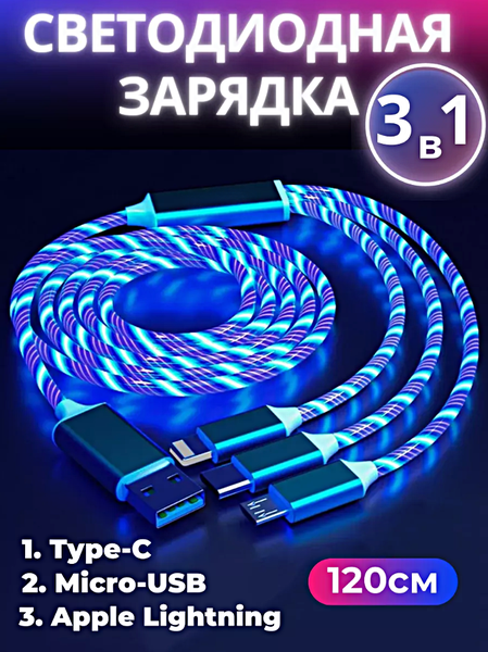 Светящийся кабель для зарядки 3 в 1 с возможностью зарядки трех мобильных устройств одновременно имеет удобные дополнительные возможности. Ваш стиль может быть выдержан вплоть до зарядки телефона. Световой эффект интересно имитирует движение тока по проводам. Универсальный шнур сэкономить не только время, но и место. Она обеспечивает возможность одновременного подключения type-c, micro usb и lightning для iphone, использующегося для зарядки и синхронизации устройств Aрple. Световой эффект. Удобная опция позволяет легко находить кабель в темноте или в слабо освещенных местах. Это удобно, если зарядка устройства осуществляется в ночное время суток, в дорожной сумке, транспорте. Его легко идентифицировать и выделить среди пучка других проводов. Провод удобен в машине – свободно дотягивается от места подключения до держателя на лобовом стекле. На фоне других подобных аксессуаров выделяется. В высоком темпе современной жизни шнур для телефона должен быть всегда под рукой, иметь качественные спайки, чтобы не подвести в ответственный момент и давать возможность одновременного питания нескольких устройств. Если у вас возникли вопросы или трудности с нашим товаром, пожалуйста, сообщите об этом в чате с продавцом, во вкладке - Заказы.