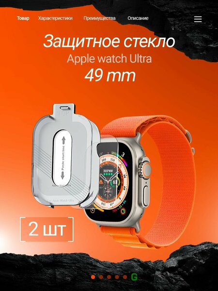 Защитное стекло для Ваших iWatch Ultra первого и второго поколения изготовлено из закаленного стекла, устойчиво к ударам и царапинам. Толщина 0,33 мм защищает экран, не искажает цвета и не влияет на работу сенсорного дисплея. Инновационная система для самостоятельной установки с пресс-формой позволяет идеально наклеить стекло без примерок и отцентровки. установка: Для установки стекла Вам нужно протереть экран спиртовой салфеткой и убрать разводы салфеткой из микрофибры, которые идут в комплекте. Затем зафиксировать часы на платформе и приложить рамку со стеклом и провести пальцем по стрелочке, как показано на видео. Автоматическая установка с системой удаления пыли представляет собой плёнку-наклейку, самостоятельно удаляющую крупные пылинки и клеевую основу, которая не позволит образоваться пузырькам. Комплектация: Защитное стекло с установочным механизмом - 2 шт. Салфетка влажная - 2шт. Салфетка из микрофибры - 2 шт. Стикер для удаления пыли - 2 шт. Шпатель для разглаживания -1 шт.