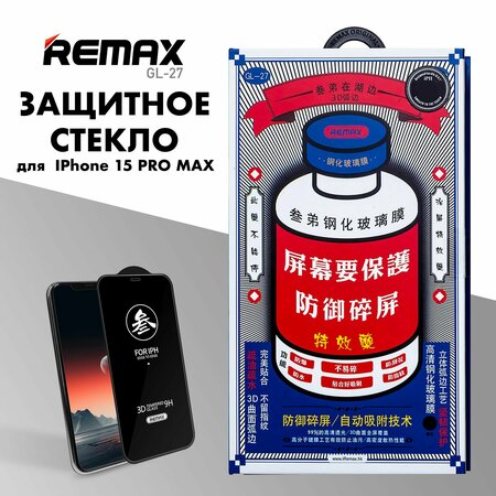 Защитное стекло для Айфон 15 Pro Max Remax GL-27, спиртовая салфетка из микрофибры, стикеры для удаления пыли, инструкция по наклеиванию, надежная упаковка