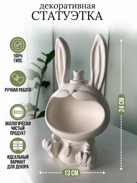 Очаровательная конфетница Зайка - легкий способ освежить сервировку и элегантно подать дома или в офисе, простые угощения. Ваза для конфет имеет оригинальный дизайн в Виде фигуры зайца , станет изюминкой Вашей кухни или офиса. Гипс экологически чистый материал, идеально для красивой сервировки конфет и фруктов, как стойка для десертов. Также можно использовать как органайзер для предметов. Конфетницы также можно использовать как подставки для мелочей, ключей. Заяц украсит ваш стол и подчеркнет прекрасный вкус хозяина, а также станет отличным подарком. Конфетница с кроликом идеально подходят для встречи гостей на ресепшене.
