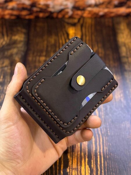 Зажим для купюр из натуральной кожи изготавливается полностью в ручную. Благодаря натуральной коже и ручному прошиванию, аксессуар в разы превосходит аналоги по прочности и долговечности. Удобное и практичное изделие Предусмотрены шесть карманов для карт/визиток, зажим для купюр. Характеристики: высота 11 см. ширина 8.6 см, толщина 1.5 см. кожа - натуральная ( крупный рогатый скот ) нить - вощенная 1 мм. фурнитура - метал застежка - кнопка упаковка - Подарочная деревянная коробка Аксессуар изготовлен из натуральной кожи КРС высшего сорта. Кожа в меру плотная, приятная на ощупь и запах. Со временем кожа примет форму под наполнение и приобретет неповторимый винтажный вид. Полноценная ручная работа/ Мы не занимаемся перепродажей. Каждый аксессуар создается кропотливым ручным трудом с внимание каждой детали. Кошелек прошит в ручную крепкой вощенной нитью толщиной 1 мм, края обработаны специальной эмульсией для кожи. Подарочная деревянная упаковка делает обложку для документов отличным вариантом для подарка себе и близким. Обратите внимание, оттенок на фото зависит от условий освещения и настроек экрана.
