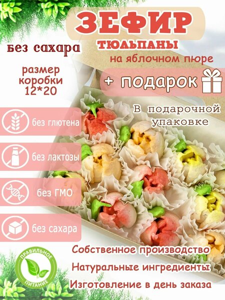Тюльпаны из ПП Зефира! Это прекрасная возможность порадовать зефирными цветами себя или своих родных зефиром без сахара, отличный вариант для тех кто следит за калориями, на одну зефирку всего 7 Ккал. Воздушный зефир изготавливается непосредственно перед отправкой под заказ. Важно, что это один из немногих десертов который можно при сахарном диабете. Так как в его состав входит натуральный сахарозаменитель — эритрит, аллюлоза. Тюльпаны из ПП Зефира с яркими вкусом яблока , весом 120 г - ПП сладость, которую можно есть при похудении без глютена, безопасен для потребления детям и взрослым. Это натуральный продукт, созданный специально для женщин, стремящихся к похудению и правильному питанию. Упаковка данного продукта выполнена в крафтовой коробке, что делает его подарочным вариантом. Лента, обертывающая коробку может быть разного цвета, в зависимости от наличия. Благодаря индивидуальной и яркой упаковке, этот зефир прекрасно подойдет для подарка на 8 марта, новый год , день рождения, юбилей. Этот низкокалорийный продукт обладает свежим и воздушным вкусом, который понравится как детям, так и взрослым. Вся продукция изготавливается по домашним рецептам и отвечает высоким стандартам качества. В составе ПП зефира используются только натуральные ингредиенты, такие как яблочное пюре, яичный белок, агар-агар, эритрит, натуральные пищевые красители-распылители и вода. Благодаря отсутствию жиров, зефир станет прекрасным выбором для тех, кто следит за уровнем холестерина в крови и хочет поддерживать здоровый образ жизни. Комбинация ингредиентов в зефире придает этому продукту неповторимый вкус и делает его незаменимым дополнением к чаю или другим напиткам. Каждому кусочку зефира придается аромат и вкус яблока так как он на натуральном яблочном пюре, а нежная текстура придает ему дополнительную сочность и насыщенность. Это продукт, который сочетает в себе все нужные составляющие для любителей сладкого и здорового питания. Бодрящий и вкусный, он прекрасно подходит для тех, кто хочет сохранить фигуру, а также кто учится, работает или просто наслаждаться моментами вкуса. Не упустите возможность ощутить всю силу натуральных продуктов, попробовав Тюльпаны из ПП Зефира!