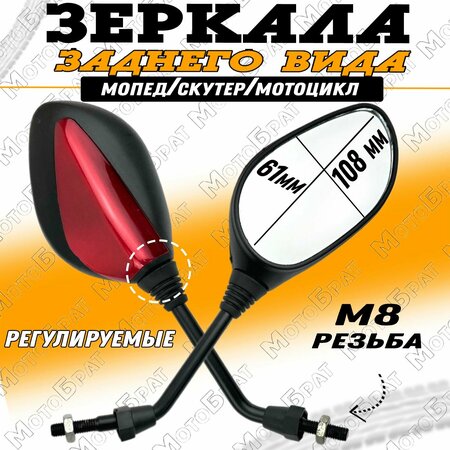 Зеркала заднего вида для мотоциклетной техники, пара (правое и левое) черно-красные . Размер зеркальной поверхности — 108х61 мм. Общая длина зеркала 265 мм. Длина кронштейна — 135 мм. Резьба для крепления зеркала — 8 мм, направление резьбы на обоих зеркалах — правое. Гайка для крепления под шестигранный ключ на 14. Корпус зеркала изготовлен из пластика. Кронштейн выполнен из металла и оснащён резиновой накладкой. Зеркало регулируется и меняет угол обзора. Зеркала продаются в комплекте.
