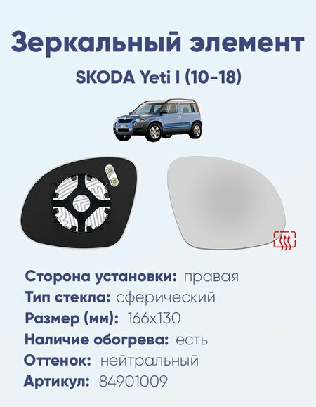 Зеркальный элемент для автомобилей SKODA Yeti I с 2010 по 2018 год выпуска для правой (пассажирской) стороны с антибликовым сферическим стеклом нейтрального тона и системой обогрева. Для информации - габаритный размер зеркального элемента 130х166 мм.