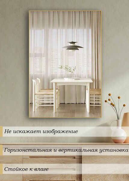 Элегантное настенное зеркало в прямоугольной золотой алюминиевой раме станет стильным дополнением вашего интерьера. Модель размером 40х60 см идеально впишется в любое помещение, будь то ванная комната, прихожая или спальная зона. Современный и утонченный дизайн этого интерьерного аксессуара подчеркнет вашу изысканность и чувство стиля. Прочная алюминиевая рама, окрашенная в золотой цвет, обрамляет тонкое зеркало толщиной 4 мм, обеспечивая ему долгий срок службы, а также придавая модный и лаконичный вид. Эта модель отлично подойдет для создания дополнительных световых эффектов в пространстве, визуально расширяя его и добавляя глубину. Легкость монтажа, надежность креплений позволяют быстро и надежно установить этот функциональный элемент декора, в самых разных уголках квартиры, офиса или загородного дома. Комбинируя это зеркало с другими элементами интерьера, например с алюминиевыми фоторамками из нашего ассортимента, вы создадите гармоничную и уютную атмосферу в любой комнате. Зеркало, за счет возможности горизонтального и вертикального способа навешивания, подойдет для установки в самых различных пространствах, добавляя нотку современного шика и утонченности окружению.
