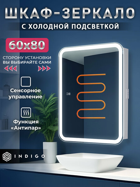 зеркало-шкаф, подогрев, подсветка, полочка, регулировка яркости подсветки, с розеткой, с сенсорным выключателем подсветки