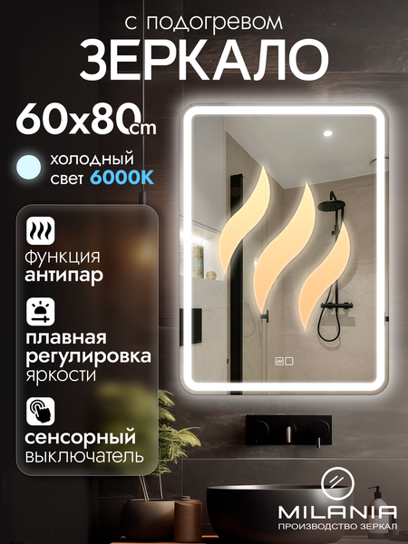 Настенное зеркало с подсветкой и подогревом в ванную Laino 60х80 см (ореольная подсветка, холодный свет 6000К, сенсорное управление, прямоугольное зеркало для ванной, функция Антипар)