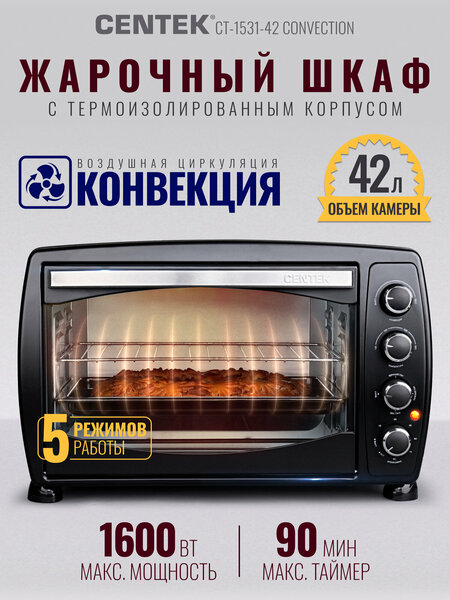 Жарочный шкаф Centek CT-1531-42 Convection - это идеальное решение для вашей кухни, дома или дачи, где высокое качество и удобство приготовления пищи имеют первостепенное значение. С объемом 42 литра и мощностью 1600 ватт, эта мини-печь позволяет готовить разнообразные блюда с легкостью и быстротой. Функция конвекции обеспечивает равномерное прогревание пищи, что способствует более качественному и быстрому приготовлению блюд. Вы можете воспользоваться пятью режимами работы, чтобы выбрать оптимальный способ приготовления. Это делает устройство многофункциональным помощником на вашей кухне, позволяя готовить все - от выпечки до мясных блюд. Таймер на 90 минут предоставляет вам возможность заняться другими делами, не переживая о времени. Эта электрическая духовка настольного типа идеально вписывается в любой интерьер и легко находит свое место на кухонном столе. Компактные размеры позволяют использовать ее даже в условиях ограниченного пространства. Жарочный шкаф Centek CT-1531-42 Convection- это не просто удобство, это также возможность приготовить домашние блюда, которые порадуют вашу семью и друзей. Эта электропечь станет надежной помощницей для всех любителей кулинарии, которые ищут простоту в приготовлении вкусных и полезных блюд. Не упустите возможность обновить свою кухонную технику! Жарочный шкаф с функцией конвекции наилучшим образом соответствует современным требованиям к удобству и качеству приготовления пищи. Сделайте свой процесс готовки максимально комфортным и эффективным с помощью этой практичной и стильной электрической духовки.