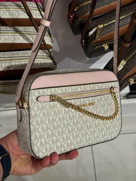 Женская сумка кроссбоди ваниль-розовая с цепью и золотой фурнитурой Michael Kors Outlet Jet Set Item Leather Crossbody Bag 35S1GTTC9B