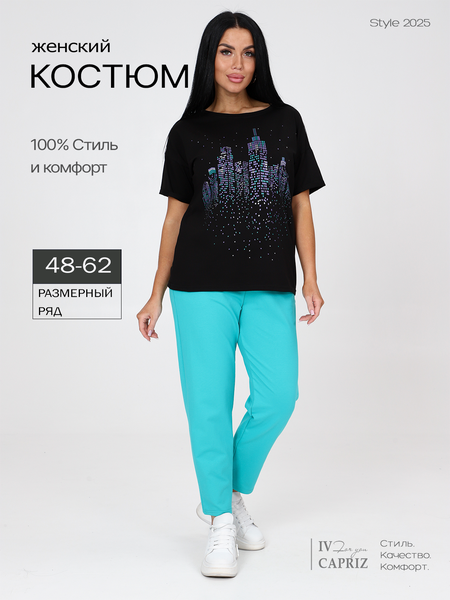 Модный и при этом очень удобный женский летний костюм от IvCapriz станет любимой вещью гардеробе. Для вашего удобства комплект выполнен из нескольких видов ткани: 1. футболка из трикотажного полотна высшего качества кулирка с лайкрой (95% хлопок, 5% лайкры), мягкий, легкий, дышащий материал; 2. брюки из футера двунитки (хлопок 72%; полиэстер 20%; лайкра 8%), суперкомфортный, приятный к телу, прочный материал. От такого костюма сложно отказаться, а все потому, что хорошее качество при умеренной цене стоит во главе угла. Наш костюм прекрасно подойдет в качестве одежды для работы, спорта, прогулок и походов по магазинам, выезда на природу, дачу и просто для отдыха дома. Комплект поможет чувствовать себя уверенно и привлекательно без особых усилий. Футболка с коротким рукавом свободного кроя и укороченные брюки 7/8 выгодно подчеркнут достоинства фигуры и скроют недостатки. За счет широкого размерного ряда трикотажный костюм можно подобрать на любой тип фигуры от маленького до большого размера, а также беременным и кормящим мамам. Комплект в универсальной темной расцветке подойдет для любой возрастной категории. Женский костюм - это практичный подарок девушке, жене, сестре, подруге или дочке на 8 Марта, Новый Год и Рождество. Трикотажный комплект рассчитан на рост 164-170см, длина верха по спинке 63-71 см, в зависимости от размера, длина брюк по боковому шву 90-93 см. Чтобы изделие радовало вас как можно дольше, соблюдайте следующие рекомендации: стирать при температуре до 30ºС с вещами, подходящими по составу; желательно использовать жидкие щадящие средства; режим отжима 600-800 оборотов; избегать отбеливания и сушки в стиральной машине; гладить при средних температурах; при стирке вручную избегать излишнего трения, не отжимать вручную, позволяя воде спокойно стечь. Параметры модели на фото (ОГ-ОТ-ОБ) 97-71-101