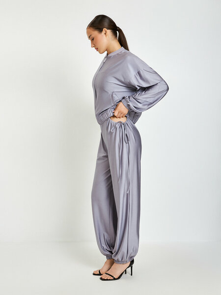 Женские брюки-парашюты изготовлены из сияющей серебристой ткани. Стильная и комфортная модель без подклада дарит большую свободу движениям благодаря свободному крою. Эластичный пояс на резинке обеспечивает качественную посадку для любого типа фигуры. По бокам расположены декоративные разрезы со сборками на тесьме, придающие брюкам оригинального шика. Низ брючин присобран на резинку для качественного прилегания и сохранения формы изделия. Стилизуйте модель в образах для прогулок и встреч с друзьями, а также создайте целостный утонченный аутфит с курткой-бомбером: 31201000002