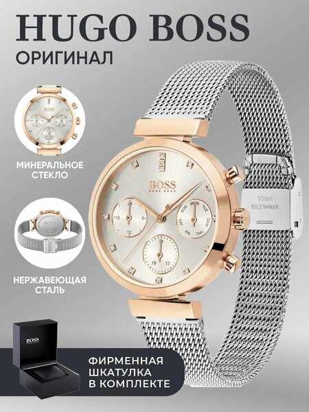 Женские часы Hugo Boss – это оригинальные наручные часы, которые идеально подойдут для работы, школы. Стильные часы станут отличным подарком на годовщину, День матери, 8 Марта, День святого Валентина или Новый год для внучки, дочки, сестры, девушки или любимой. Они идеально подойдут для девочек, девушек, бабушек, мам и любимых женщин Корпус часов изготовлен из нержавеющей стали. Минеральное стекло с антибликовым покрытием, а также с противоударным механизмом защищает циферблат от царапин и повреждений. В некоторых моделях используется сапфировое напыление для дополнительной защиты. В некоторых часах имеется круглый циферблат с кристаллами, добавляещий часам ювелирного блеска и элегантности. В ассортименте представлены как кварцевые модели, так и механические с автоподзаводом, хронографом и таймером. В некоторых моделях используется японский механизм. Часики Хьюго босс представлены с различными ремешками: кожаными, стальными, силиконовыми, металлическими и керамическими. Стальной браслет с PVD покрытием придает часам дополнительную прочность. Тактические часы мк доступны в различных цветах, включая черные, серебряные, золотые и розовое золото. Фирменные часы Босс всегда в тренде и подойдут для классического стиля. Большие и маленькие ручные часы bos с браслетом идеально подходят на руку и подчеркнут индивидуальность и статус своей владелицы. Расширенная гарантия 3 года.