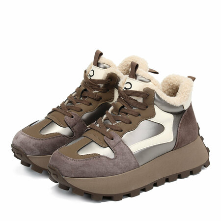 RESPECT представляет новую линейку - RSP LAB, ориентированную на поклонников стиля, в котором спортивная, повседневная и вечерняя эстетика нашли компромисс. Центральное место в коллекции занимают кроссовки и кеды для прогулок по городу. Они легко вписываются в гардероб. Объединяют в себе технологии, которые используются при производстве обуви для тренировок. Эластичная обтекаемая подошва помогает равномерно распределить вес и снизить ударную нагрузку при ходьбе. Перфорированный текстиль обеспечивает микроциркуляцию воздуха. Прочная фурнитура надежно фиксирует обувь на ноге. Женские зимние кроссовки Respect: комфорт и тепло для ваших ног. Женские зимние кроссовки Respect коричневого цвета из замши на шерсти станут отличным выбором для зимнего сезона. Натуральная шерсть, используемая в качестве подкладки и стельки, обеспечивает тепло и комфорт в холодную погоду. Верх кроссовок выполнен из текстиля, что гарантирует долговечность и износостойкость. Материал подошвы – ТЭП, который обеспечивает надежное сцепление с поверхностью и амортизацию ударов. Застежка на шнуровке позволяет надежно зафиксировать обувь на ноге и обеспечивает комфорт при ходьбе. Тип пронации этих кроссовок – нейтральный, что подходит для большинства людей и обеспечивает комфортное ношение на протяжении всего дня. Выбирайте женские зимние кроссовки Respect для комфорта и тепла в зимний сезон!