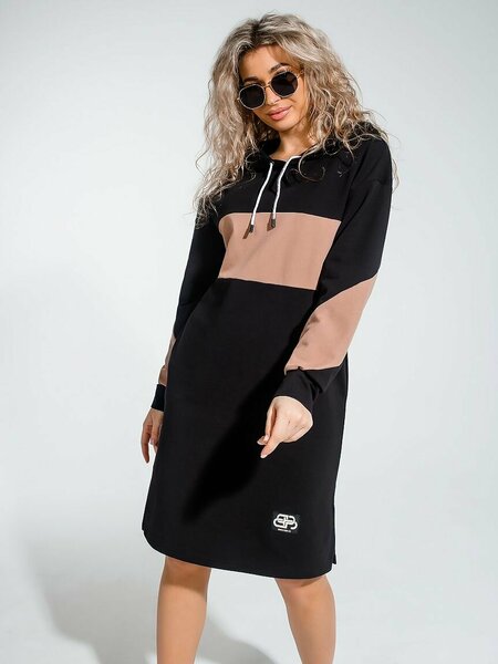 Женская туника из трикотажного полотна футер, прямого свободного силуэта, длиной до колена. Плечо спущенное, рукав втачной, длинный, с манжетой по низу. Боковые внутренние карманы. Разрезы по низу. Капюшон с кулисой и шнурком и люверсами. Вставки рукава и изделия выполнены из трикотажа контрастного цвета. Спереди фирменный шеврон. Ворот: округлый вырез Детали одежды: с капюшоном, с карманами, с разрезами в швах, с люверсами Рукав: длинный, втачной, с манжетами Сезон: весна, лето, осень Стиль: кэжуал (casual), повседневный, спорт шик Фасон: прямой, свободный, длина ниже колена
