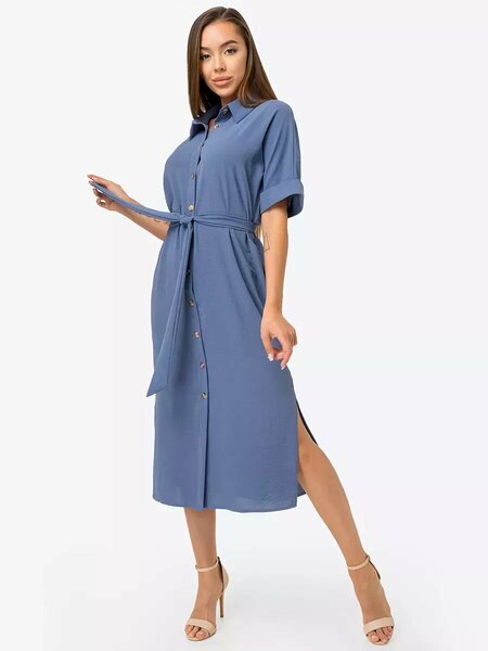 В этом легком платье каждое движение наполнено нежностью и волшебством. Женское платье-рубашка выполнено из фактурной ткани жатка и создано для знойных летних дней. Забудьте про глажку! Модель выполнена из ткани, которая не мнется. Благодаря своим свойствам однотонное платье красиво драпируется на теле, создавая воздушные складки и небрежные линии. Платье свободного прямого кроя с цельнокроеным рукавом представлено в синем цвете. Изящная планка на пуговицах и отложной воротник добавляют образу нотку строгости. По желанию талию можно элегантно подчеркнуть поясом и создать идеальный силуэт. Синее платье-рубашка с удлиненным рукавом с подворотом – отличное решение для лета, платье из вискозы прекрасно подходит для отдыха на пляже или прогулок летом. Для удобства передвижения по бокам предусмотрены глубокие разрезы, в боковых швах расположены карманы. Платье длины миди – это отличный выбор для стильной и уверенной в себе девушки, будь то ежедневный поход на работу или отпуск на море. Летнее платье идеально для пляжного отдыха или пикника на свежем воздухе. Рост модели 170, параметры: объем груди 88, объем талии 67, объем бедер 97. На ней размер 44.