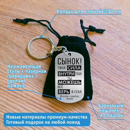Жетон/брелок с лазерной гравировкой "Сынок, твоя сила внутри тебя, ты сможешь всё, верь в себя. От мамы" / Подарок в премиум-исполнении, в подарочной упаковке Подарок сыну на любой праздник от мамы. Нержавеющая сталь, лазерная гравировка, кольцо для ключей, подарочная упаковка - бархатный мешочек