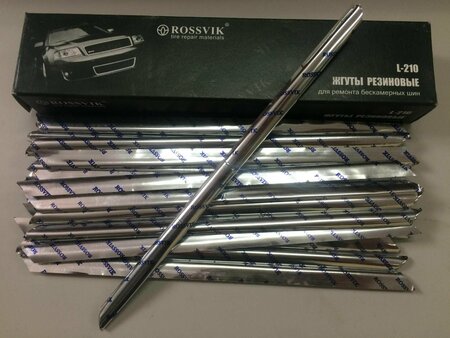 Резиновые жгуты можно устанавливать в протекторной и плечевой частях покрышки. Специальная адгезивная резина, покрывающая жгут, заполняет микротрещины в месте ремонта и обеспечивает отличную прочность ремонта. Жгуты Rossvik применяются как для ремонта уже демонтированных шин, так и для ремонта шин на диске. 25 шт. в коробке.