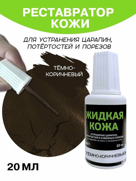 Кожа жидкая Liquid Leather темно-коричневая Resmat во флаконе объемом 20 мл, в комплекте с кисточкой для нанесения. Внимание, на второй фотографии данной карточки товара и видео показан реальный «живой» темно-коричневый цвет этой кожи. Всю цветовую палитру кожи можно увидеть внутри магазина, кликнув на логотип или ссылку «все товары», далее категория хозяйственные товары, восстановители кожи. Относится к средствам по уходу за одеждой, обувью и мебелью, предназначена для ремонта, восстановления и устранения царапин, потертостей, трещин, порезов, прожогов на изделиях из кожи и кожзаменителей. Профессиональная крем-кожа может склеить края порезов, закрасить потертости, убрать следы от кошачьих когтей. Превосходно проникает в материал, после высыхания и полимеризации не расслаивается, при сжатии восстанавливает исходную форму, обладает водоотталкивающим эффектом, имеет полуглянцевый блеск. Перед применением флакон необходимо тщательно взболтать. В зависимости от сложности и вида повреждения наносить в несколько слоев, предварительно дождавшись высыхания предыдущего слоя 20 минут, постепенно заполняя дефекты. Пока средство не высохло, излишки можно убрать влажной тряпочкой или салфеткой. Полное высыхание через 24 часа. В основе средства водно-полимерный раствор, поэтому при загустевании можно разбавить водой, но не более 10% от общей массы. Также в составе модифицирующие добавки, воски, красящие пигменты, силикон. Морозоустойчивая, влагостойкая, удобно наносить кисточкой, губкой, ватной палочкой, не пачкается и не растекается. Поставляется во флаконе 20 мл, блистерной упаковки нет. Размер флакона 7,5 х 3 х 3 см, вес 35 г. Инструкция по нанесению указана на флаконе и инструкции вкладыше. Можно колеровать и смешивать с другими цветами этой фирмы. Обратите внимание, что из-за индивидуальных настроек вашего экрана цвет продукта на втором фото может незначительно отличаться от истинного. Сделано в России.