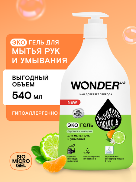 Жидкое эко мыло для рук и умывания WONDER LAB, с ароматом бергамота и мандарина , 0,5л (540 мл)