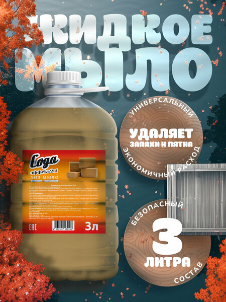 "Жидкое хозяйственное мыло Сода эффект 2 в 1", объемом 3 литра, представляет собой универсальное решение для чистоты и свежести вашего дома. Но это не просто мыло. Это уникальная комбинация мощи и эффективности соды, заложенной в каждом капле. Уникальная формула 2в1 тщательно и бережно очищает, справляясь с самыми сложными загрязнениями. Больше нет необходимости тратить время и энергию на долгое натирание - сода в составе мыла отбеливает поверхности, оставляя их безупречно чистыми, как в день покупки. "Жидкое хозяйственное мыло Сода эффект 2 в 1" станет вашим незаменимым помощником в борьбе с пятнами и загрязнениями на любых поверхностях. Оно легко справляется с загрязнениями в ванной, на кухне, в гостиной и даже на открытых верандах. Благодаря удобному флакону объемом 3 литра, этого удивительного средства хватит на долго. Это не только экономичный, но и экологичный выбор, поскольку формула мыла не содержит вредных для окружающей среды веществ. Доверьте уход за чистотой и свежестью вашего дома "Жидкому хозяйственному мылу Сода эффект 2в1". Позвольте себе наслаждаться блеском чистоты и свежестью каждый день! Откройте для себя универсальное средство для чистоты и уюта в вашем доме — жидкое хозяйственное мыло "Сода Эффект" 2в1. Это инновационное мыло сочетает в себе мощные очищающие свойства и заботу о вашем здоровье и экологии. Оно идеально подходит для мытья рук, а также для стирки и удаления загрязнений с различных поверхностей. Состав "Сода Эффект" включает натуральные компоненты, которые обеспечивают бережное, но эффективное очищение. Благодаря уникальной формуле, это мыло легко справляется с жиром, грязью и даже сложными пятнами, не повреждая ткани и поверхности. Используйте его для стирки одежды, мытья посуды или уборки в доме — универсальность этого продукта вас приятно удивит! Жидкое мыло Сода обладает легким и свежим ароматом ромашки, который наполняет ваше пространство ощущением чистоты и комфорта. Оно подходит для всей семьи, включая детей и людей с чувствительной кожей, так как не содержит агрессивных химических веществ и красителей. Это делает мыло китайское отбеливающее идеальным выбором для домашнего использования. Легкость в использовании — еще одно преимущество мыло хозяйственное 72% "Сода Эффект". Просто нанесите небольшое количество хозяйственное мыло с содой на загрязненное место, слегка потрите и смойте водой. Вы увидите, как грязь и жир исчезают на глазах, оставляя после себя только свежесть и чистоту. Кроме того, жидкое хозяйственное мыло "Сода Эффект" 2в1 — это экономичный вариант для вашего бюджета. Благодаря своей высокой концентрации, вам потребуется всего капля для достижения отличного результата. Вы можете быть уверены, что это мыло хозяйственное китайское отбеливающее станет вашим надежным помощником в ежедневной борьбе за чистоту. Выбирайте "Сода Эффект 2в1" — и вы получите не только качественное средство для уборки, но и заботу о здоровье вашей семьи и окружающей среде.