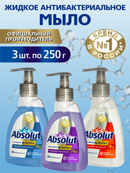 Жидкое мыло антибактериальное Absolut микс набор Коллаген, Гиалурон, Пантенол - поддержание гигиены и заботы о коже рук. Удобный экономичный формат упаковки флакон с дозатором 3 штуки по 250 гр (750гр), которые подходят как для дома, так и для офиса. Антибактериальное жидкое мыло содержит уникальную формулу и нейтральный pH. Набор обеспечивает упругость, увлажняет, успокаивает кожу. Сочетание активных компонентов обеспечивает тройное действие: антибактериальный эффект, увлажнение и защиту кожи. При этом продукт имеет приятный аромат, который оставляет тонкий шлейф на коже. Жидкое мыло НЕ парфюмированное. Мыло жидкое для рук российского производства компании Весна под брендом Абсолют, предназначенный для мытья рук, лица и тела. Средство эффективно очищает кожу от загрязнений, не вызывает сухости и раздражения, благодаря содержанию увлажняющих компонентов. Подходит для ежедневного использования. Не содержит: триклозан и триклокарбан, силиконов и парабенов. Абсолютная защита для всей семьи. Официальный производитель.