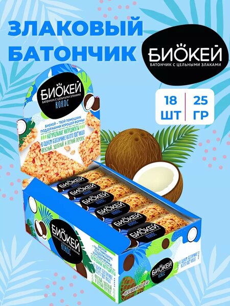 Злаковые батончики биокей с кокосом 18 шт по 25 гр. Это вкусный, удобный и легкий перекус, который зарядит вас энергией сложных углеводов. Злаковые батончики биокей с кокосом вкусный, полезный перекус, способный зарядить вас энергией сложных углеводов. Батончики изготовлены на Алтае и содержат в составе натуральные ингредиенты – цельные злаки и кокос