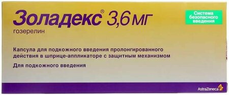 Одна капсула содержит: Активное вещество: гозерелина ацетат 3, 6 мг или 10, 8 мг (в пересчете на гозерелин-основание) Вспомогательные вещества: молочной и гликолевой кислот сополимер (50: 50) до общей массы 18, 0 мг (препарат Золадекс® 3, 6 мг ), низкомолекулярный молочной и гликолевой кислот сополимер (95: 5) и высокомолекулярный молочной и гликолевой кислот сополимер (95: 5) до общей массы 36, 0 мг (соотношение между низкомолекулярным и высокомолекулярным сополимером — 3: 1, по массе) (препарат Золадекс® 10, 8 мг ).