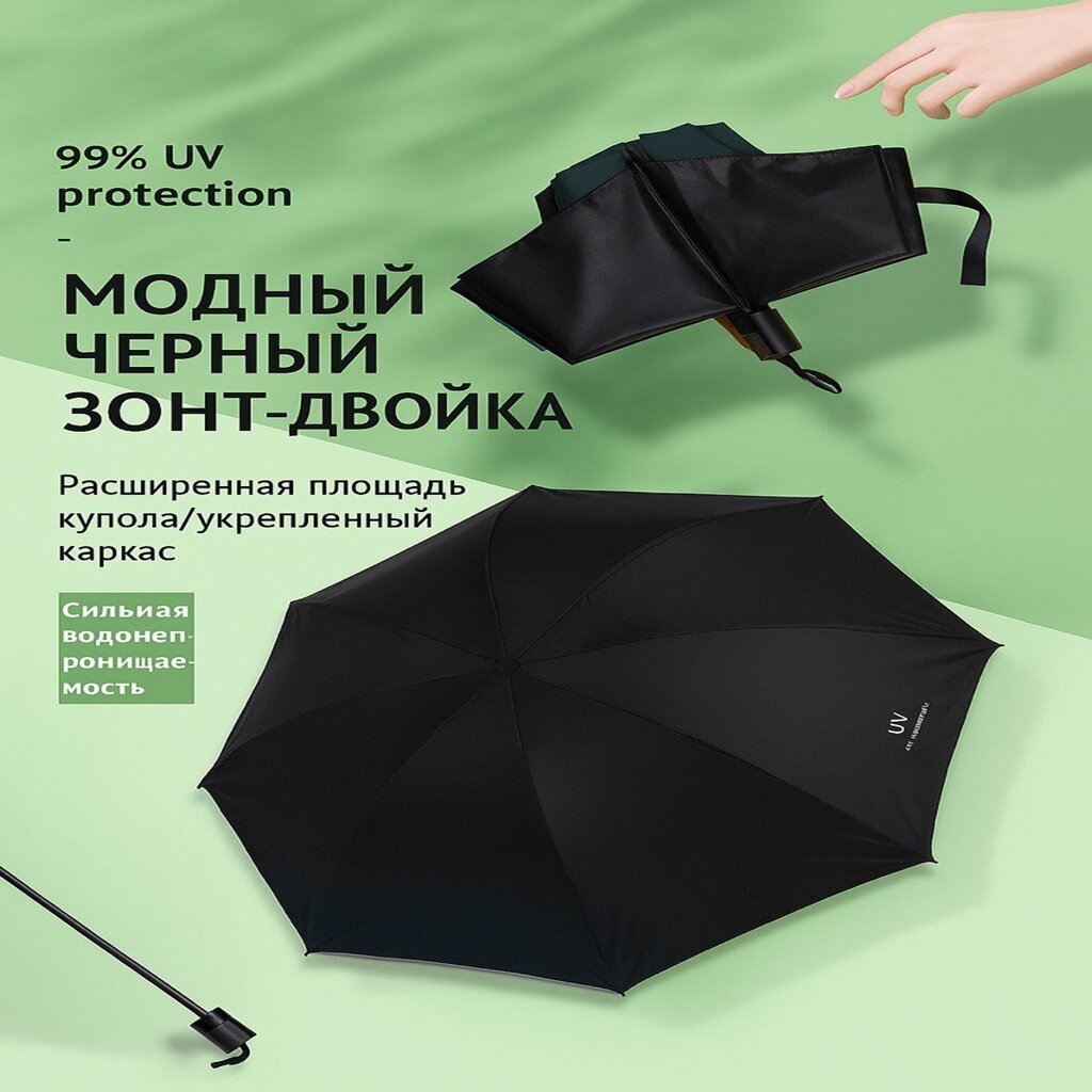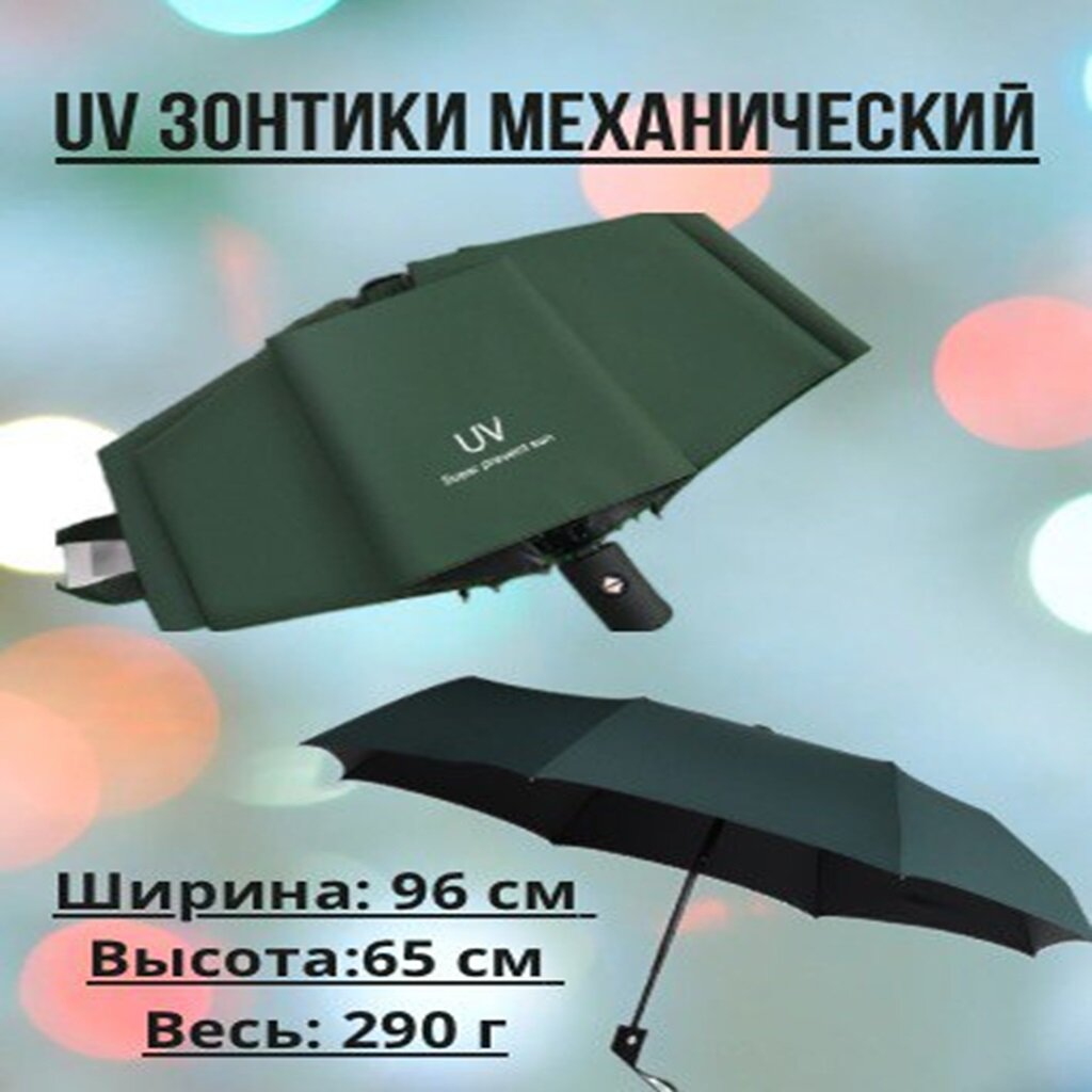 Характеристика изделия: • Тип: складной, трёхсложный. • Цвет: тёмно-зелёный. • Материал купола: плотная ткань с UV-защитой (предохраняет не только от дождя, но и от солнечных лучей). • Механизм: автоматический (открытие/закрытие кнопкой). • Ручка: удобная, с петлёй для фиксации на руке. • Назначение: подходит и для дождя, и для солнца. Особенности и преимущества: • 2 в 1 — защита от дождя и солнца. • Компактный размер — удобно носить в сумке или рюкзаке. • Устойчив к выгоранию и промоканию. • Подходит для ежедневного использования. • Универсальный дизайн — стильный и лаконичный.