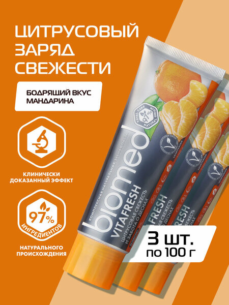 Комплексная натуральная зубная паста Biomed Vitafresh, 100г. Цитрусовая свежесть и укрепление эмали Зубная паста биомед витафреш обеспечивает свежесть дыхания, дарит душевное равновесие и заряжает энергией. Препятствует размножению бактерий, вызывающих неприятный запах изо рта Ключевые компоненты: - Экстракт ананаса, содержащий бромелайн, обеспечивает очищение эмали от зубного налета. - Ключевые компоненты – гидроксиапатит кальция и L-Arginine – востанавливают и укрепляют зубную эмаль, снижая чувствительность зубов - Бромелайн расщепляет зубной налет, цитрат цинка обеспечивает свежесть дыхания, а экстракты подорожника и листьев березы оказывают мощный антикариесный и противовоспалительный эффект - Натуральные эфирные масла грейпфрута, мандарина, лимона и мяты, богатые витаминами C, B2 и PP - Экстракты подорожника, листьев березы и косточек красного винограда обладают антикариесным эффектом и укрепляют десны НЕ содержит: SLES, парабены, фтор, триклозан, хлоргексидин, PEG Клинически доказанный эффект очищения за 30 секунд! Для оптимального результата рекомендуется чистить зубы в течение 2 минут. Наша зубная паста рекомендована для всей семьи: детям от 6 лет и взрослым.