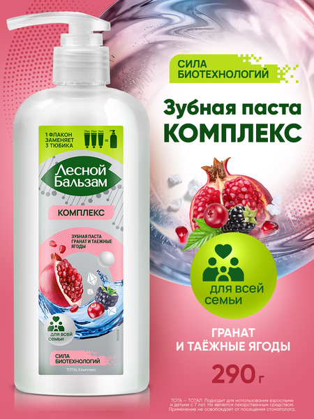 Для ежедневного ухода за зубами и полостью рта попробуй зубную пасту Лесной бальзам TOTAL Комплекс для всей семьи Гранат и таежные ягоды, в составе которой 95% ингредиентов натурального происхождения*. Увеличенный объем во флаконе с удобным дозатором экономичен в использовании: одного нажатия достаточно для одной чистки зубов. Флакон вмещает в себя 3 тюбика зубной пасты и рассчитан на 4-5 месяцев использования. Зубная паста воздействует комплексно: • Поддерживает естественную белизну и здоровье зубов. • Укрепляет зубную эмаль, предупреждая возникновение чувствительности зубов, благодаря наличию в составе минеральной соли и экстрактов трав (ромашки, тысячелистника, зверобоя, чистотела и крапивы). • Удаляет налет и защищает от кариеса благодаря содержанию фторида натрия в активной концентрации. • Мягко освежает дыхание.
