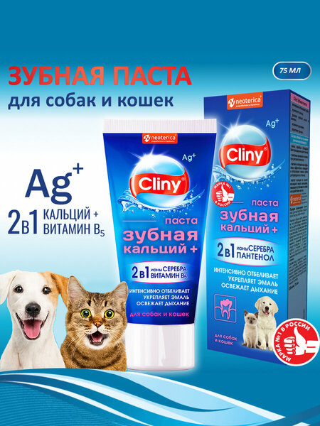 Зубная паста Cliny: - отбеливает и укрепляет эмаль зубов; - удаляет зубной налет и камень; - освежает дыхание; - снимает воспаление и укрепляет десны. Состав зубной пасты имеет уникальную формулу: - ионы серебра обладают бактерицидным действием; - пантенол заживляет слизистую ротовой полости; - лактат кальция насыщает эмаль кальцием, повышает устоичивость зубов к воздействию кислот; - ксилит помогает усвоению кальция, защищает от бактерий, вызывающих кариес; - округлые меловые частички бережно отбеливают зубную эмаль; - папаин растворяет налет и отбеливает зубы, уменьшает воспаление и кровоточивость десен. Порядок применения: применяют для чистки зубов и ухода за полостью рта собак и кошек. Намочите зубную щетку, нанесите на неё необходимое количество пасты, дайте питомцу попробовать, после чего круговыми движениями почистите зубы. После чистки зубов предоставьте животному доступ к свежей питьевой воде. Для оптимального очищения процедуру следует проводить 2 – 3 раза в неделю в течение 2-3 минут. Паста не пенится и не требует смывания, безопасна при проглатывании.