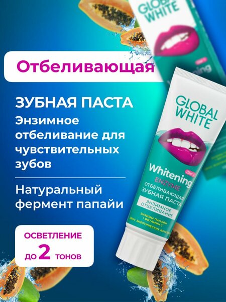 Зубная паста Global White Enzyme «Энзимное отбеливание» — для деликатного ухода и естественной белизны зубов ⸻ Назначение и особенности продукта Global White Enzyme — это низкоабразивная профессиональная зубная паста, разработанная для мягкого, но эффективного удаления налета, улучшения цвета эмали и повышения гигиены полости рта. Особенность пасты заключается в использовании ферментов (энзимов), которые расщепляют органические остатки и пигменты без механического воздействия, тем самым обеспечивая щадящее отбеливание и безопасность даже для чувствительных зубов. ⸻ Активные компоненты и их действия Папаин (Papain) — натуральный фермент из папайи • Обладает протеолитическим действием — расщепляет белки, входящие в состав мягкого налета. • Эффективно удаляет пигментированные отложения от кофе, чая, табака и других окрашивающих продуктов. • Не повреждает эмаль, не вызывает чувствительности. Ксилитол (Xylitol) • Естественный сахарозаменитель с кариес-протективным эффектом. • Ингибирует рост бактерий Streptococcus mutans, препятствует образованию зубного налета и камня. • Увлажняет слизистую, освежает дыхание. Нитрат калия (Potassium Nitrate) • Снижает чувствительность зубов за счет блокировки передачи нервных импульсов от открытых дентинных канальцев. • Обеспечивает комфорт даже при гиперестезии. Витамин C (Sodium Ascorbyl Phosphate) • Антиоксидант, укрепляющий десны и капилляры. • Уменьшает воспаление, способствует регенерации тканей. • Повышает местный иммунитет полости рта.