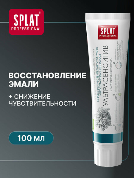 Зубная паста SPLAT Professional «Сенситив Ультра» (SENSITIVE ULTRA) укрепляет и восстанавливает эмаль, снижает чувствительность зубов. Гидроксиапатит действует подобно пломбе, запечатывая микротрещины в эмали. Глюконат цинка оказывает антибактериальное действие. Эфирные масла лимона, грейпфрута и перечной мяты обладают противовоспалительным действием и помогают при кровоточивости десен. Экстракт листьев грецкого ореха и бисаболол защищают от кариеса, предотвращают появление налета. Экстракт бифидобактерий поддерживает баланс микрофлоры в полости рта.