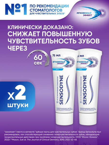 Не дайте чувствительности зубов нарушить ваши планы – зубные пасты Sensodyne помогают наслаждаться горячей и холодной едой, которую вы так любите! Зубные пасты Sensodyne помогают обеспечивать длительную защиту чувствительных зубов 1,2 для снижения болезненных ощущений, вызванных повышенной чувствительностьюзубов, а также способствуют профилактике кариеса 1,3 и свежести вашего дыхания. Позаботьтесь о здоровье полости рта вместе с зубной пастой Sensodyne Мгновенный Эффект. Зубная паста Sensodyne Мгновенный Эффект: • Уменьшает болезненные ощущения, вызванные чувствительностью зубов, за 60 секунд 1 • Имеет индекс абразивности (RDA) 120. Используйте в комплекте с любой зубной щеткой Sensodyne. 1. При использовании 2 раза в день. 2. Jeandot J et al. Efficacy of toothpastes containing potassium chloride or potassium nitrate on dentin sensitivity. Clinic (French) 2007. 3. Благодаря содержанию фтора