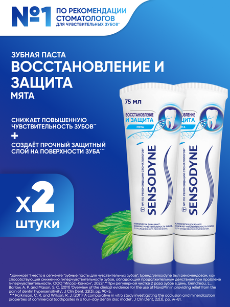 Не дайте чувствительности зубов нарушить ваши планы – зубные пасты Sensodyne помогают наслаждаться горячей и холодной едой, которую вы так любите! Зубные пасты Sensodyne помогают обеспечивать длительную защиту чувствительных зубов 1,2 для снижения болезненных ощущений, вызванных повышенной чувствительностью зубов, а также способствуют профилактике кариеса 1,3 и свежести вашего дыхания. Позаботьтесь о здоровье полости рта вместе с зубной пастой Sensodyne Восстановление и Защита. Зубная паста Sensodyne Восстановление и Защита: • Образует защитный слой на поверхности чувствительных участков зубов 1,2 для продолжительной защиты от повышенной чувствительности • Имеет индекс абразивности (RDA) 85. Используйте в комплекте с любой зубной щеткой Sensodyne. 1. При использовании 2 раза в день. 2. Jeandot J et al. Efficacy of toothpastes containing potassium chloride or potassium nitrate on dentin sensitivity. Clinic (French) 2007. 3. Благодаря содержанию фтора