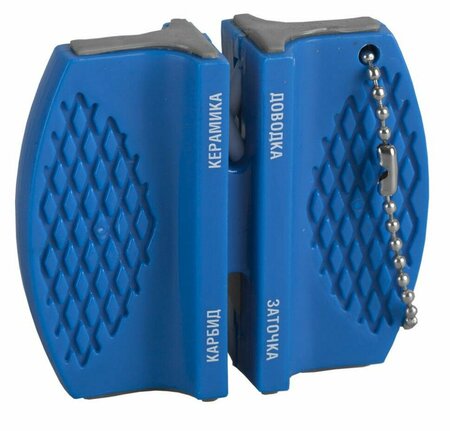 Точилка универсальная ЗУБР мастер, 2 в 1 ( 47501 ) Точилка ЗУБР универсальная, предназначена для заточки ножей всевозможных типов с металлическим лезвием. Незаменимый помощник в домашнем хозяйстве и в походных условиях • Два вида затачивающих элементов: твердосплавные пластины карбид для сильно затупленных ножей и керамические стержни для доводки и шлифовки • Для удобства и безопасности использования на боковые грани точилки нанесено противоскользящее покрытие • Компактный размер позволяет использовать точилку в походных условиях Универсальная точилка ЗУБР применяется для заточки ножей всевозможных типов с металлическим лезвием. -Количество затачивающих элементов: 2 -Заточка карбидными пластинами: да -Заточка керамическими элементами: да -Заточка алмазными элементами: нет -Защита руки: нет