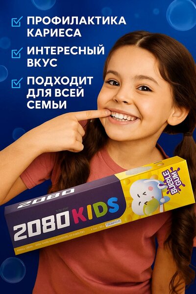 2080 Kids Bubble Gum — это безопасная зубная паста, специально разработанная для детей. Она мягко очищает зубы, защищает от кариеса и делает процесс чистки весёлым благодаря приятному вкусу жевательной резинки, который нравится детям. Преимущества: Безопасна при случайном проглатывании Содержит кальций для укрепления зубов Не раздражает дёсны Приятный аромат и вкус Bubble Gum Разработана для детей от 3 лет Активные компоненты: Кальций — укрепляет эмаль Фторид — предотвращает кариес Нежные очищающие частицы — бережно удаляют налёт Ароматизатор Bubble Gum — делает чистку зубов приятной и весёлой Объём: 80 г Страна производства: Южная Корея (AEKYUNG)