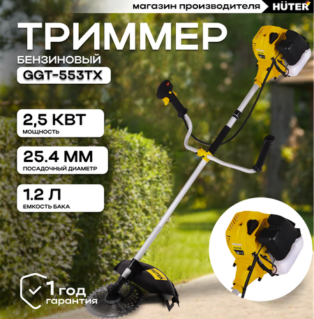 Бензиновый триммер Huter GGT-553TX - это мощный и надежный инструмент для скашивания травы, древесной поросли и кустарников. Он станет незаменимым помощником для тех, кто ценит комфорт и эффективность работы на дачном участке. Триммер оснащен верхним расположением двигателя, что обеспечивает его стабильность и надежность. Мощность двигателя составляет 2500 Вт, что позволяет справляться с различными видами растительности. Материал деки триммера - алюминиевый сплав, что гарантирует его прочность и долговечность. Корпус триммера выполнен из пластика, что делает его легким и удобным в использовании. Конструкция штанги прямая, что обеспечивает удобство и стабильность работы. Плечевой ремень позволяет равномерно распределить нагрузку на спину, делая работу более комфортной. Триммер оснащен ранцевым ремнем, что облегчает работу с инструментом. Ширина скоса ножом составляет 255 мм, а ширина скоса леской - 460 мм. Тип режущего ножа - 40ТР, перфорированный, многозубчатый с твердосплавными напайками. Тип головки с леской "Easy Load" обеспечивает безразборную заправку лески. Обороты двигателя составляют 9500 об/мин, что гарантирует высокую производительность работы. Триммер имеет Т-образную (велосипедную) форму рукоятки, что обеспечивает удобный и надежный хват. В комплект поставки входят: двигатель в сборе, штанга в сборе с редуктором, защитный кожух, режущий диск, катушка с леской, рукоятки управления (левая и правая), ранцевый ремень, комплект ключей, паспорт продукции и защитные очки. Рекомендуемая площадь скашивания составляет 100 м². Дополнительные функции кустореза/сучкореза делают этот триммер еще более функциональным и удобным в использовании.