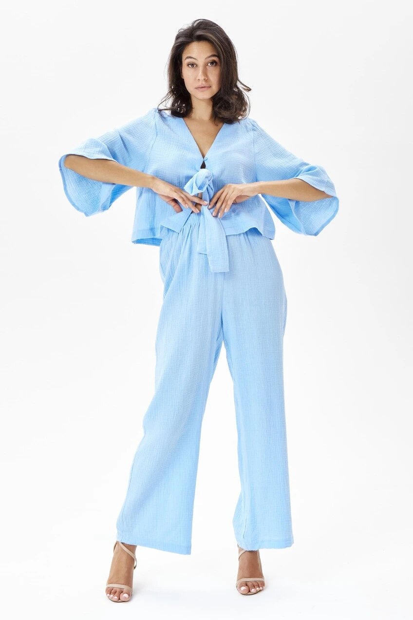 Укороченная блузка с широкой ленточной завязкой из основного материала. Имеет глубокий V-образный вырез и широкие рукава 3/4. Дополнительная застежка на воздушную петлю.